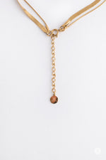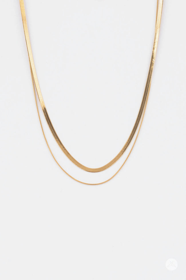 A timeless double gold snake chain necklace, measuring 16 inches in length, and made from 14kt gold plated stainless steel. Signature insignia stamped on extender