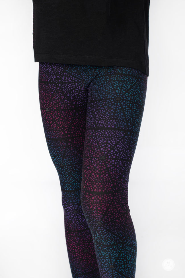 This stunning geometric print will turn heads with splashes of purple, pink, and teal on a deep black background.