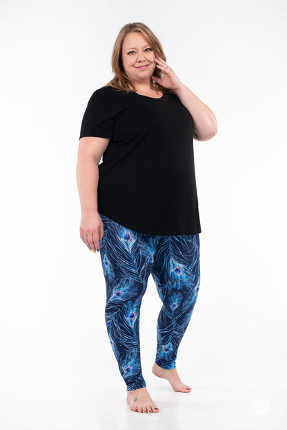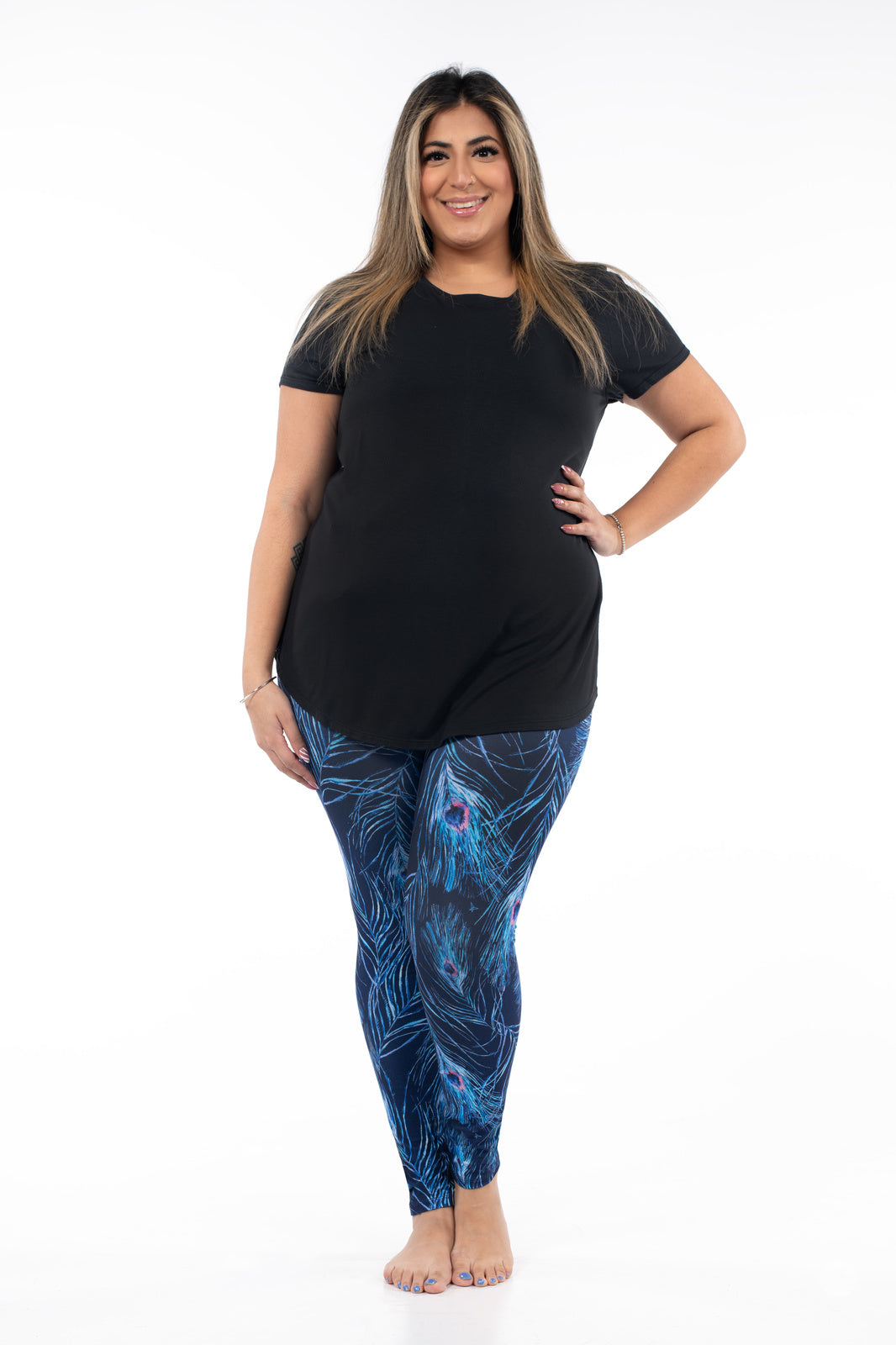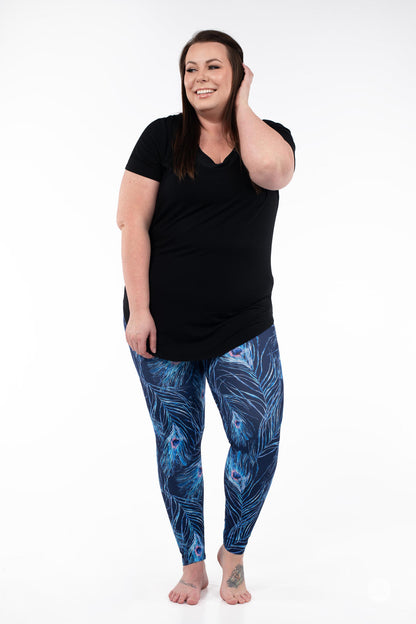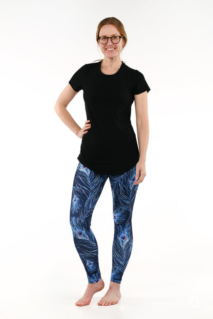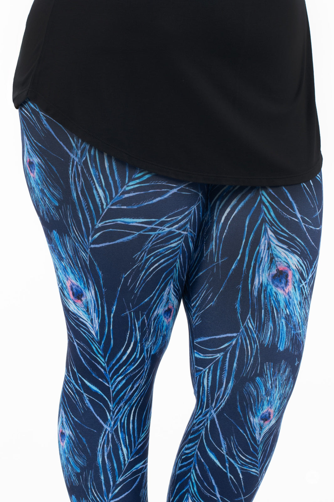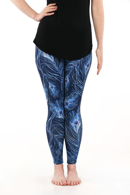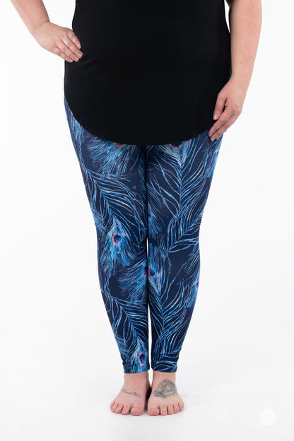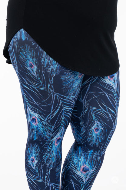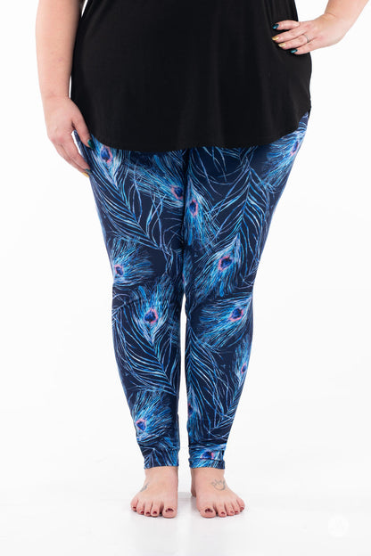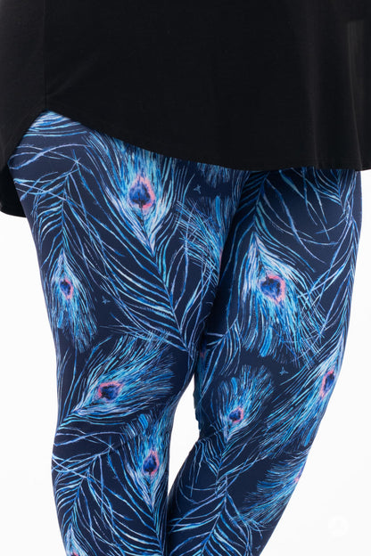 Ruffle some feathers (in style) with Feathered Glow! Inspired by peacock feathers, these leggings feature sweeping blues and pops of pink against a deep navy background. This is the style you need to show off your flair.