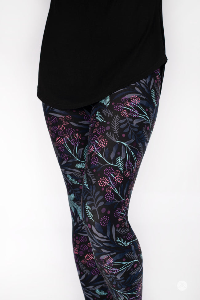 This gorgeous floral print is perfect for the cooler season and features minty conifer branches, purple and pink berries, and silvery leaves against a deep black background.