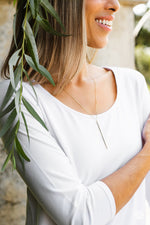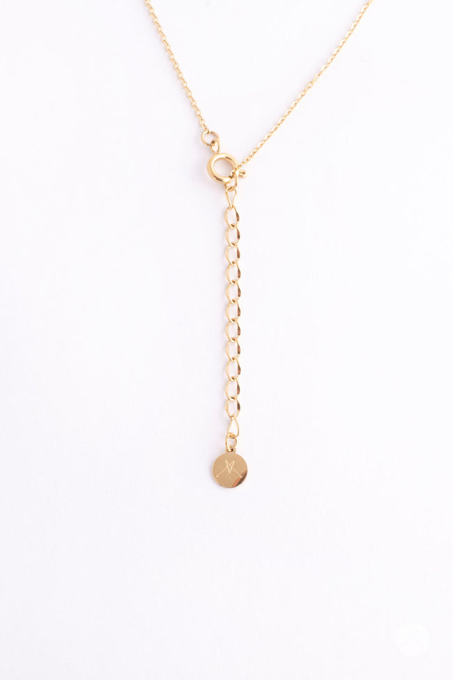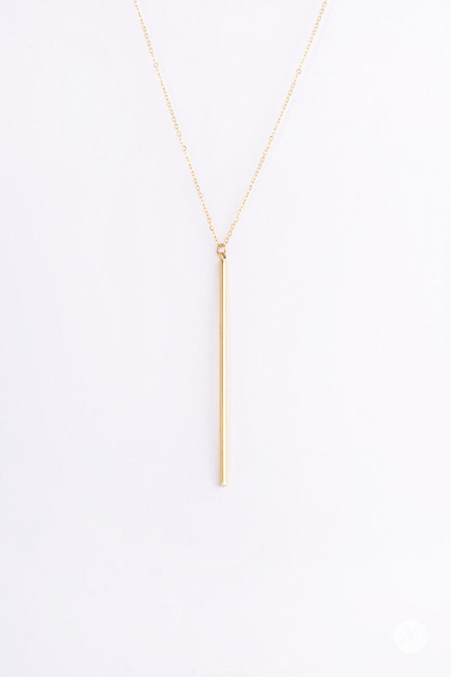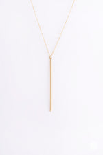 A classic gold cable chain with a long cylinder pendant. Measuring 24 inches in length and made from 14kt gold plated stainless steel.