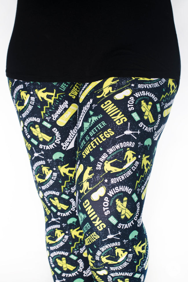 These navy-based SweetLegs feature all things hillside including snowboarding, skiing, goggles, helicopters, trees, and more in accents of chartreuse, white, and seafoam.