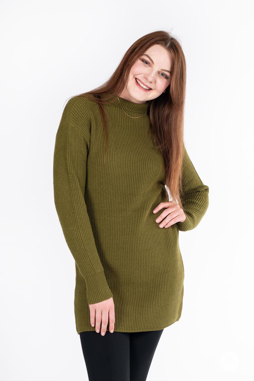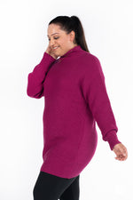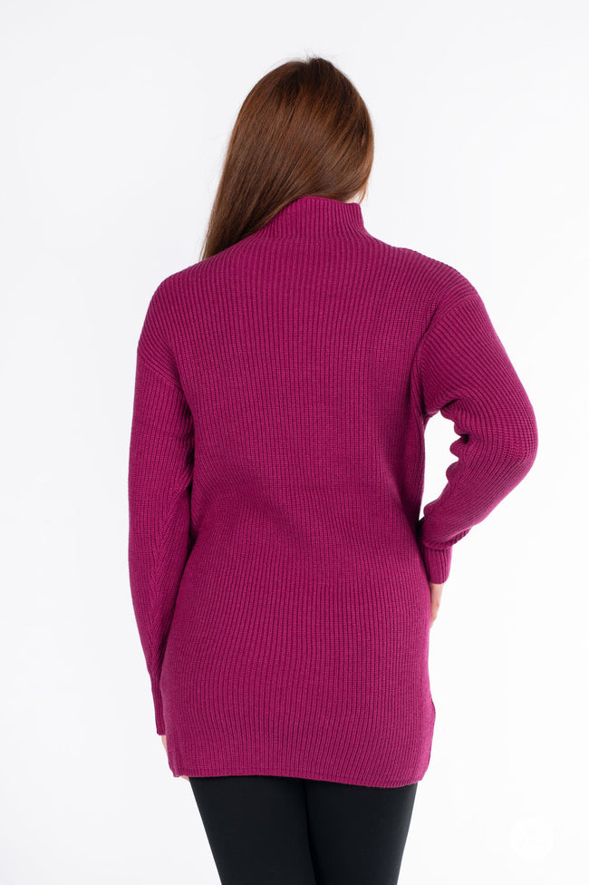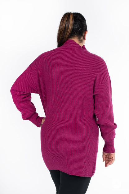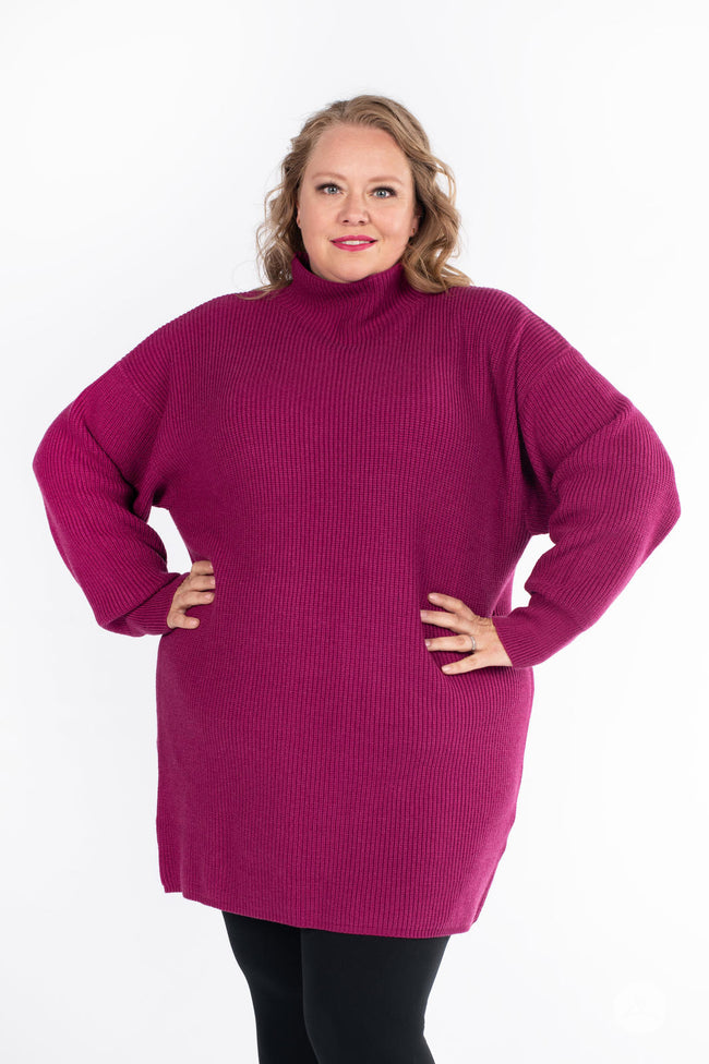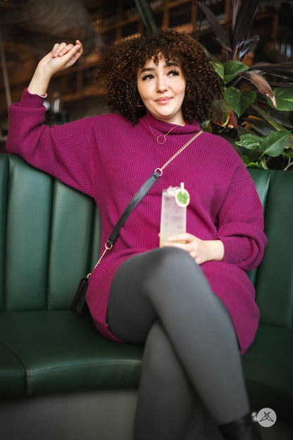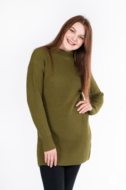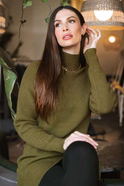 The Luxe Knit Sweater Dress, a classic wardrobe staple, is crafted from luxurious, ribbed fabric. Marrying comfort with style, it features long sleeves and a flattering mock neck design. Ideal for fall and winter, this dress pairs seamlessly with leggings for a cozy yet chic ensemble.