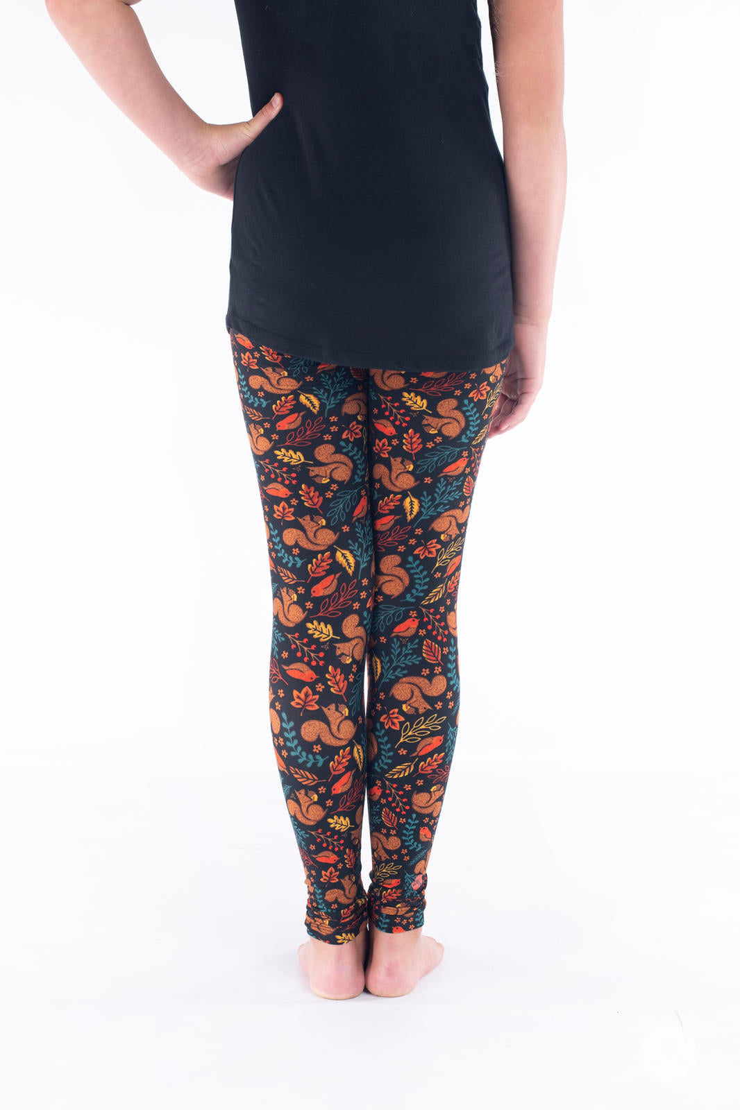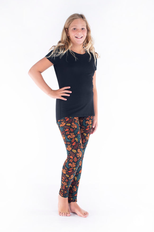 This print features fuzzy squirrels and chirping birds amongst fall foliage on a deep black background and is a perfect complement to your autumn wardrobe!