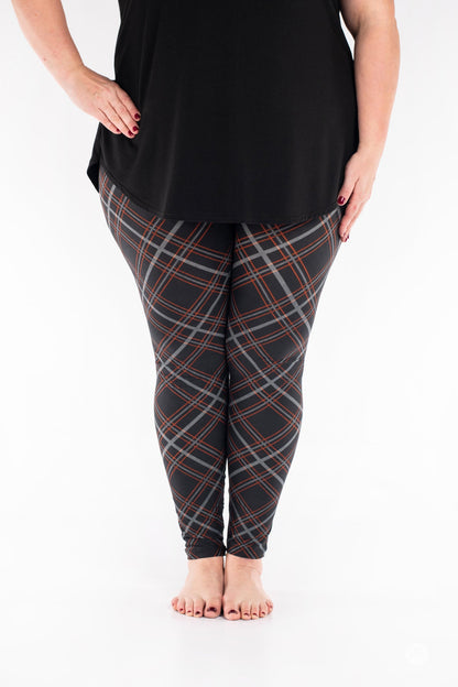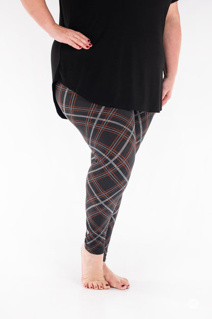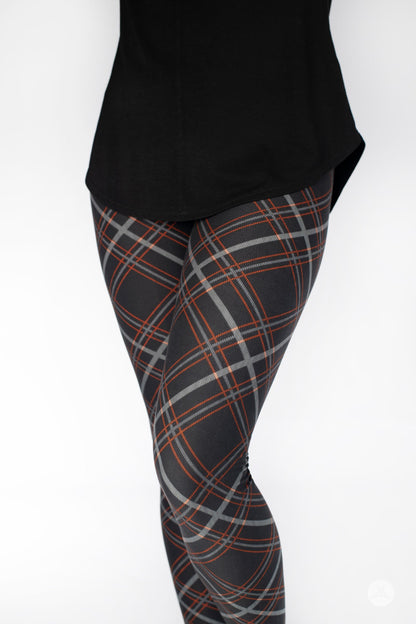 Looking for a new sophisticated wardrobe staple? This plaid print is perfect for the office with accents of orange and white on a deep black background.