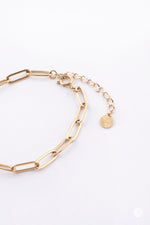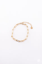 A classic paperclip chain bracelet, measuring 8 inches in length and made from 14kt gold plated stainless steel.