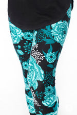 This gorgeous teal print with white accents on a deep black background features elegant horses and lush begonia flowers.