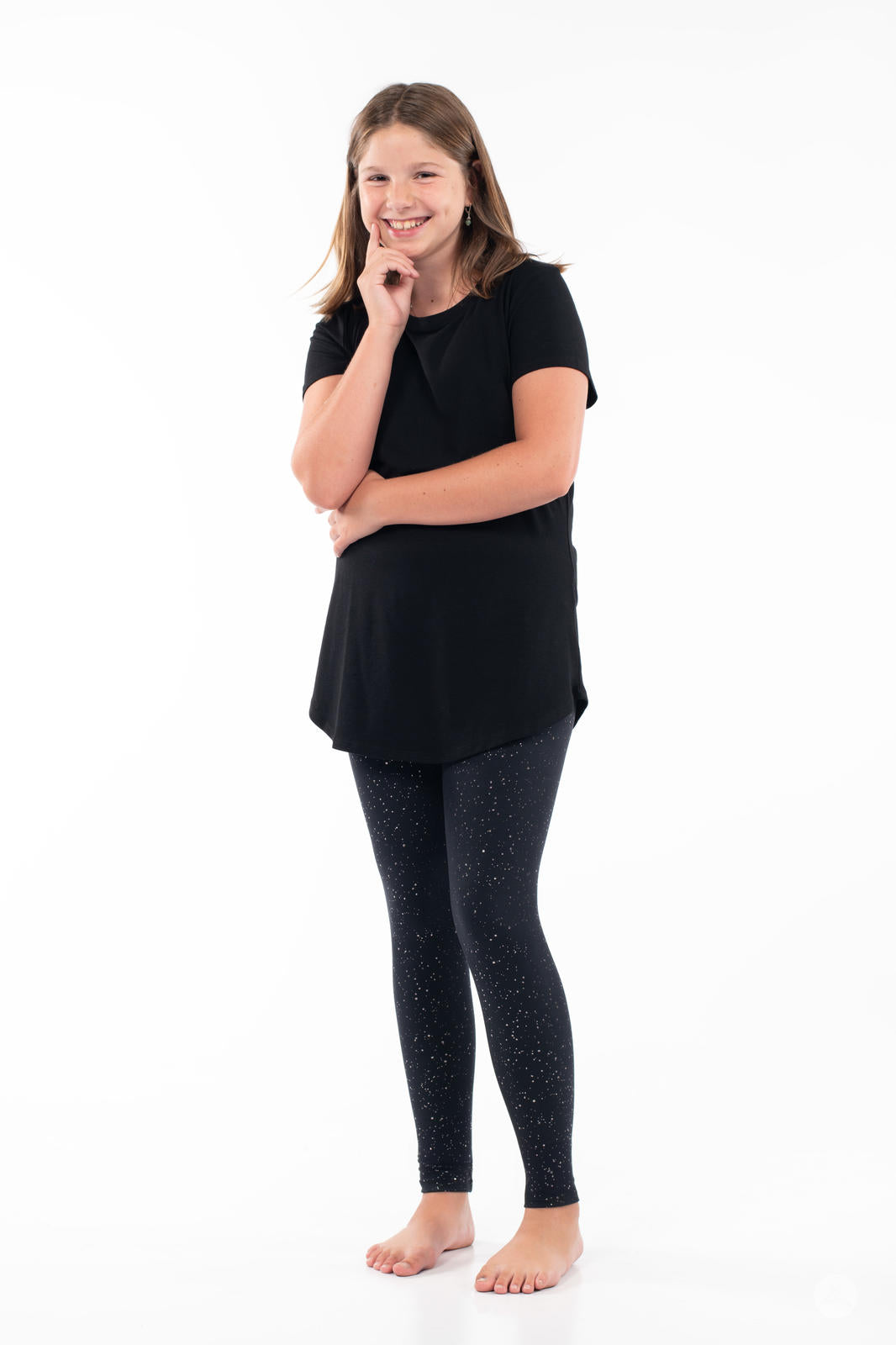 Imagine the night sky shimmering with hints of silver stardust – these Silver Sparkle Leggings bring that vision to life! Crafted with silver metallic foil detailing, sprinkled across a soft black background, they add the perfect touch of sparkle and sophistication to any kids outfit.