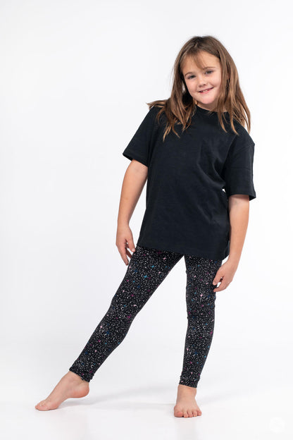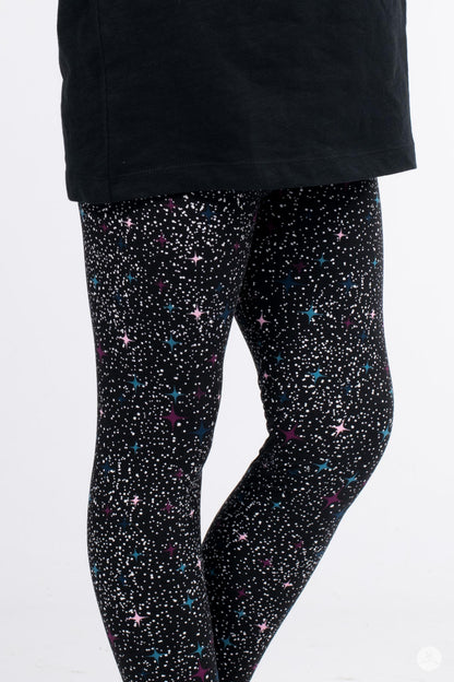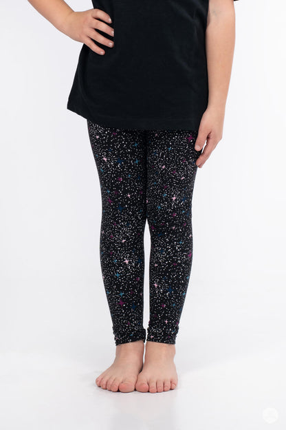 Imagine your little one spotting the Milky Way galaxy on a clear night — these dazzling kids’ leggings bring that vision to life! Featuring a magical black backdrop sprinkled with twinkling stars in shades of purple, blue, and white, they’re perfect for kids who love a cosmic vibe