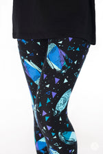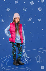 Perfect for all ages, this super fun black-based print features blue, teal, purple, and mint emperor penguins accented with triangle confetti and blowing snow.
