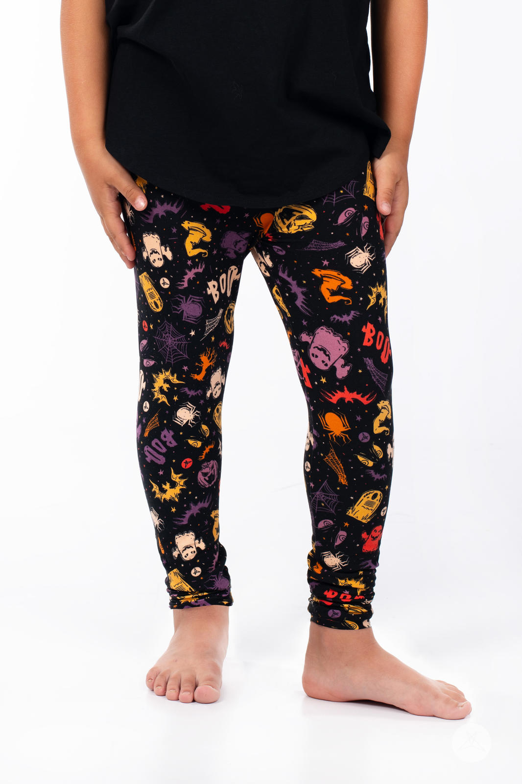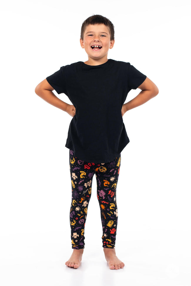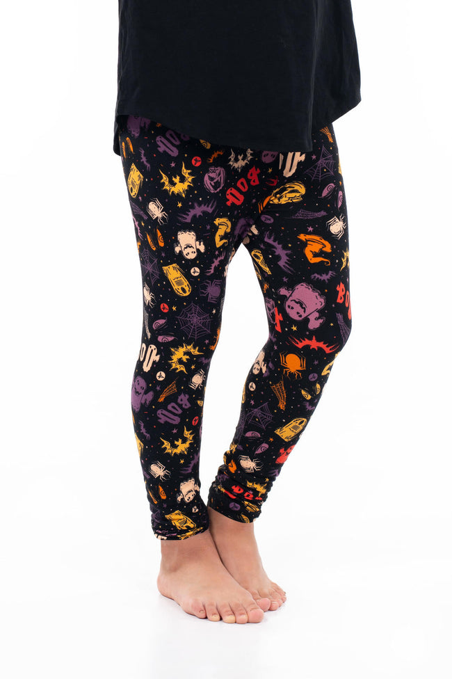 These Trick Or Treat Yourself leggings are sure to get you in the Halloween spirit. Set against a deep black background, they burst with iconic symbols of the holiday. Boasting a hauntingly vibrant palette of oranges, yellows, and purples, they're the perfect pick for your next haunting.
